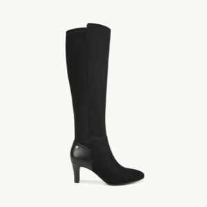 Feel the stretch in these stunningly sleek and flexible wide-calf knee-high boots, part of our best-selling Giovanna collection. Microsuede upper with a stretch back panel for ultimate flexibility, almond toe, and slip-on fit. Toe box, heel counter, and linings partially crafted with recycled materials.
