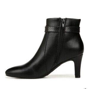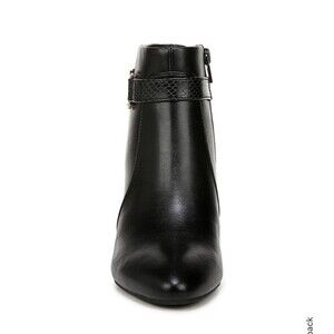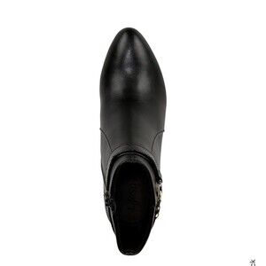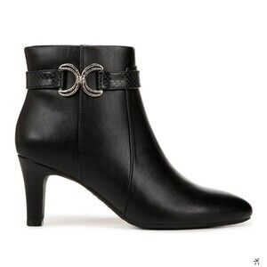 So sleek and chic, you'll never want to take off this heeled dress bootie with a sophisticated metallic detail. Faux leather upper with an almond toe, inside zip, metallic buckle ornamentation, and embossed strap detail. Linings, insole board, toe box and heel counter crafted with partially recycled materials.