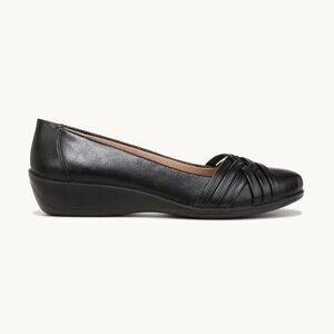 Go everywhere life takes you this season in a stylish flat with cute crisscross straps over a rounded toe. Faux leather with a round toe, slip-on fit, lightweight and flexible design, and overlapping strap design. Toe box, heel counter, and linings partially crafted with recycled materials.
