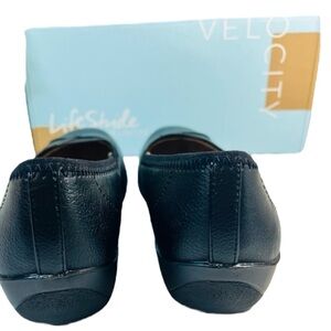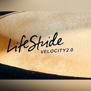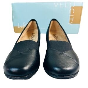 LifeStride Women's Intro Flats in black. These flats feature a faux leather upper, a round toe, and a slip-on design with stretch fabric for easy wear. The shoes also incorporate LifeStride's Soft System comfort package and Velocity 2.0 technology, providing all-day support, flexibility, cushioning, and shock absorption. They have a low heel, typically around 1.75 inches.