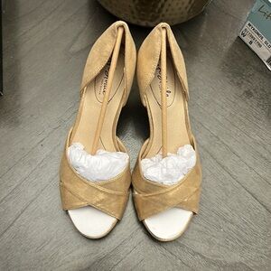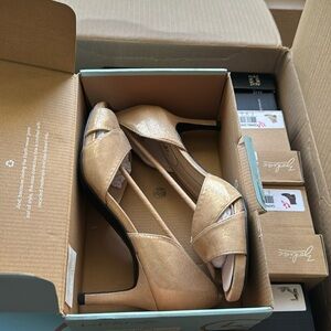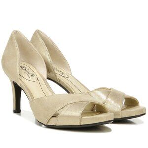 Be on the best dressed list anywhere you go in this glamorous and comfortable peep-toe pump. Soft faux leather or fabric upper with a peep toe, slip-on fit with cupped heel, and d’Orsay-inspired design. Insole partially crafted with recycled materials.