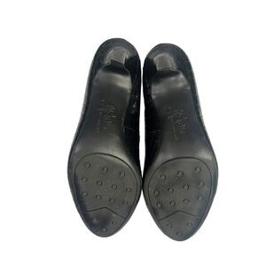 Classic and comfortable pump with an elevated crocodile print makes this such a versatile shoe! The mid heigth of the heel along with the soft system makes it a wear all day pair of shoes. These preowned shoes are in excellent condition.