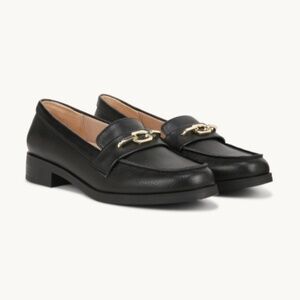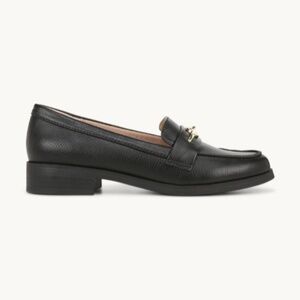 Moc loafers with modern flair. These womens slip on shoes with a standout metallic link detail always look chic. Faux leather upper with a round toe, slip-on fit, and strap with metallic link detail. Toe box, heel counter, and linings partially crafted with recycled materials.