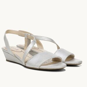 Don an easy-breezy look with the Life Stride Yasmine wedge sandal. Highlighted by asymmetrical straps, this open toe sandal has flexible and cushioning Soft System® comfort package along with stabilizing traction sole.