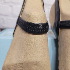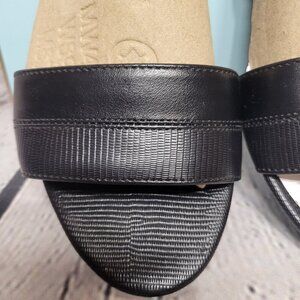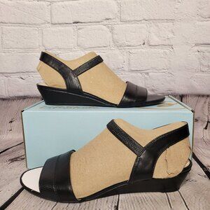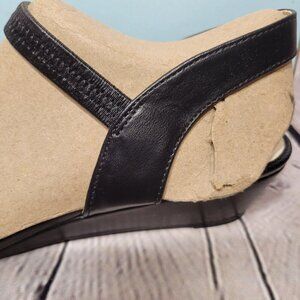 A touch of snake print and a stretch strap give this chic wedge sandal a comfy yet dressy feel. Faux leather upper with an open toe, slip-on fit, heel slingback strap, stretch gore ankle strap, and snake print accent. Easy fit with the Simply Comfort® collection. Traction sole provides you with extra stability. Just Right Height 1.25 inch wedge heel.