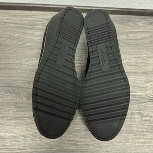 Slip into the perfect mix of sporty and tailored style in these comfortable wedge heels. Faux leather with a round toe, slip-on fit, strap with metallic logo ornament, tread sole, and lightweight and flexible design. Linings crafted from partially recycled materials