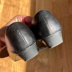 Good condition faux leather black loafers with low 1” heel height and faux gator accent with strap and button accent over toes. Light signs of wear, mostly on sole, one button and one heel as shown in photos. Soft fabric lining. Women’s size US 10M