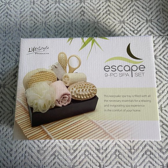 LifeStyle Products Escape 9pc Spa Set. Set includes: Massage brush, Pumice Stone, Soft towel, Mirror, Keepsake spa tray, Hair brush, Loofah, Bath sponge, Bath pouf. Brand new in box.