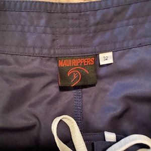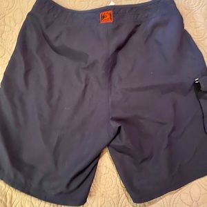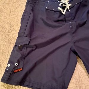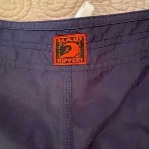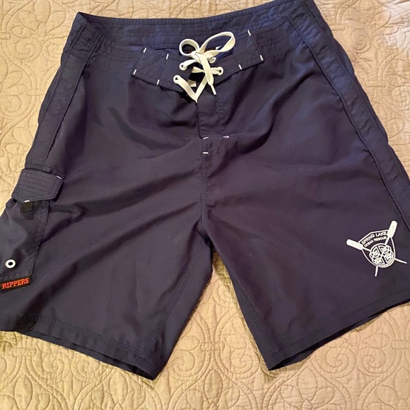 Gently used Navy blue lifeguard trunks that my sons have outgrown from previous summer jobs. Great condition. Maui Rippers. Side pocket w velcro closure. Waist tie. Logo: Spring Lake Ocean Rescue