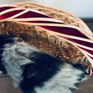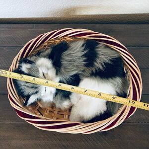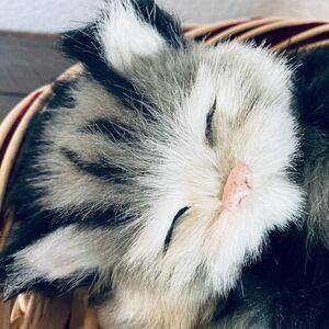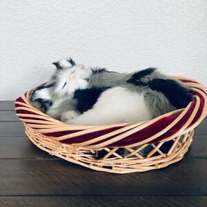 Adorable realistic plush fur peaceful sleeping gray black and white tricolor nap cat or kitten stuffed animal in light wicker basket bed. Cat is partially hot glued to the basket on the underside. Excellent like new condition, clean nonsmoking home.