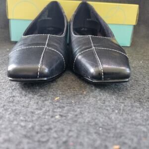 The product is a pair of brown leather LifeStride Rayburn pumps in size 8.5 with a slip-on style and block heel. These square toe heels are designed for a business occasion, featuring a low heel height and made of leather with a medium shoe width. The simple and stylish design makes them a versatile choice for professional settings.