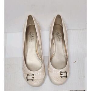 Lifestride Women’s 9M Slip Ons Cream Snake Skin Texture W/ Buckle Low Wedge Heel