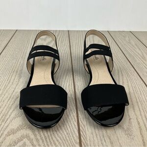Love your look every time you slip on this stylish wedge sandal. Fabric upper with open toe, slip-on fit, elastic goring straps for extra flexibility, and patent accents at the wedge and heel strap.