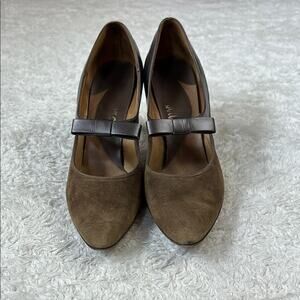 Soft brown suede heels with pointed toes and leather bow accent. Size is 6 AA which is narrow