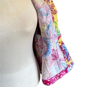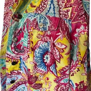 This fuchsia, blue, yellow and white, multicolored, light denim jacket is fully patterned in a paisley print. It features two chest pockets and button closure.