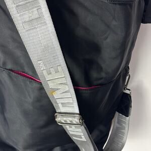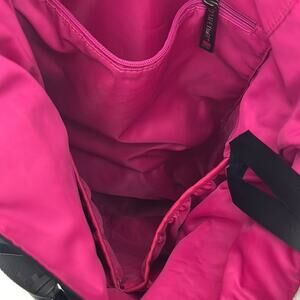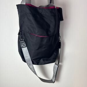 Gently Used Lifetime Fitness Tote Bag. Black throughout. Light gray Lifetime Fitness text repeating on the straps. This could be carried or crossbody. Bright pink interior. Multiple exterior and interior pockets. Would make a great gym bag or on the go bag!