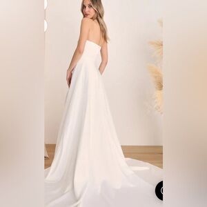 DESCRIPTION: Celebrate your storybook romance with a picture-perfect look you'll always cherish in the Lulus Lifetime of Love White Satin Strapless A-Line Gown! This romantic bridal gown has a sturdy woven matte satin waist sits atop a cascading A-line maxi skirt, with two layers for an extra boost of volume, and a luxurious draping train at the back. A striking thigh-high side slit adds a sultry finish for your special day! CONSTRUCTION: bust: Great for any cup size. waist: Fitted - very fitted at natural waist. hip: Not Fitted - fuller skirt allows room for hips. undergarments: Padded cups - May be worn with an adhesive bra, petals, or no bra. fabric: Fabric has no stretch. length: Floor length. Size 8 measures approximately 65.5" from top to bottom. Details Shell: 100% Polyester. Lining: 100% Polyester. Do Not Wash. Do Not Dry Clean. Professional Spot Clean Only. Reverse For Care. Rhinestones, Pearls, Beads, Must Be Covered... See More Imported. Fully Lined. Dress Measures 16" Longer At Back. Style 2009856 CONDITION: New Without Tags. Tags and hang straps have been cut to prevent returns Dresses may have been tried on. WHITE dresses may have dust from pallet and need spot cleaning. I will point out any major flaws. ABOUT ME: 👠 NEW TO POSHMARK? Save $10 on your 1st purchase by using my referral code: ELEGANTRESALE 😊 I’m open to offers! ❤️ Thanks for shopping my closet! 🚭 Smoke free home! 📦 Fast Shipping!