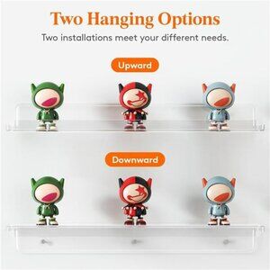 🧿2 Ways to Install: The two hanging options are upward or downward. Acrylic shelves come with pre-drilled holes, detailed instructions, and all necessary mounting hardware, including screws, wall anchors, and bubble lever, which make installation simple and easy in just a few minutes.