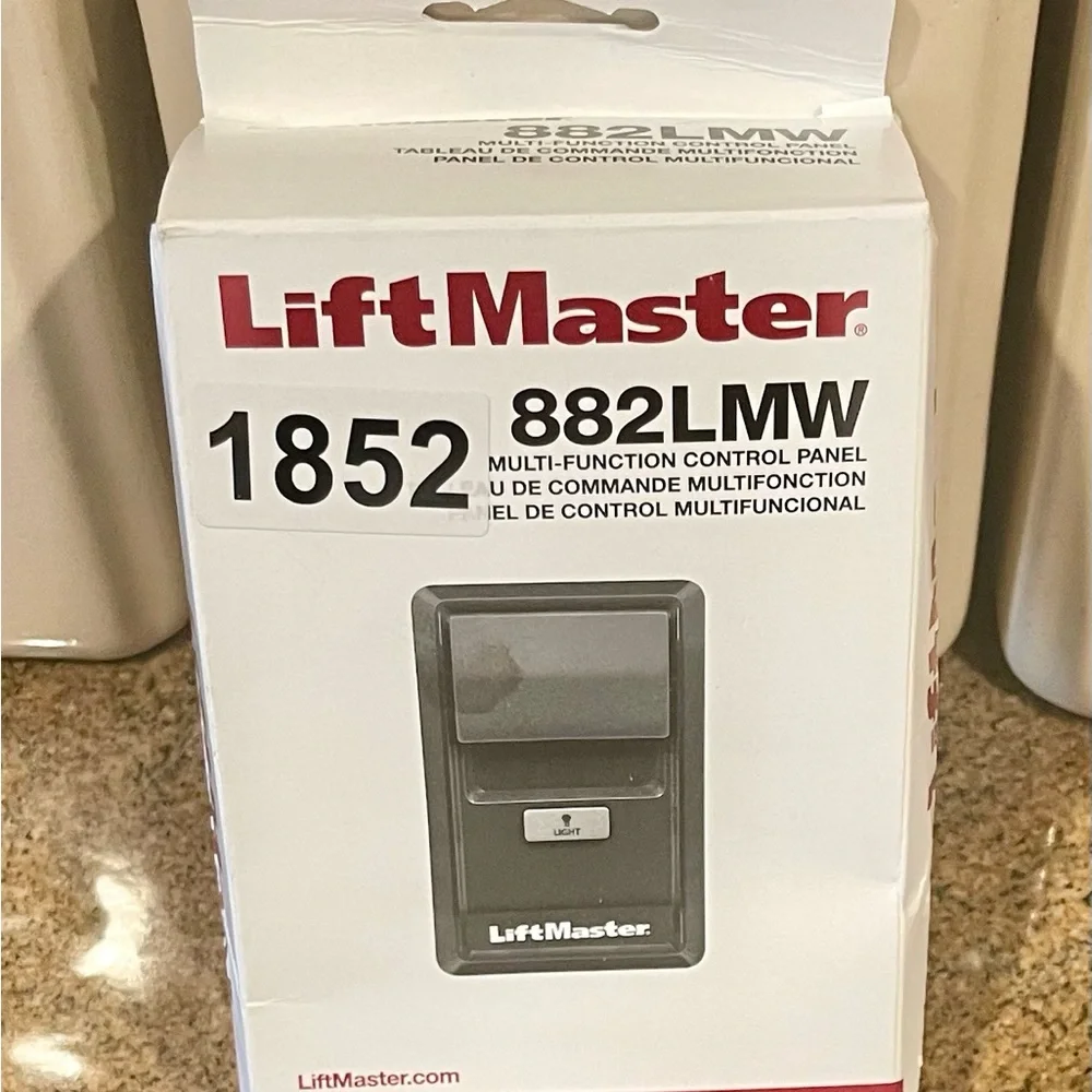 LiftMaster 882LMW multi-function control panel in black. Sleek and functional design.