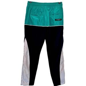 Made from high-quality fleece/polyester, these sweatpants feature a retro-inspired design with bold teal/blue color blocking and stylish design.