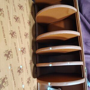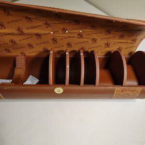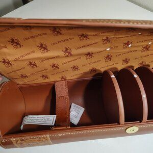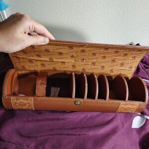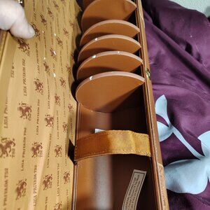 Overall good condition with one ding to the leather on one outside end, a few dings to the leather on the inside where the dividers meet the liner. Otherwise looks to have never been used.