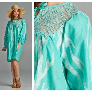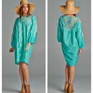 Embroidered 100% Cotton dress with lace detailing in front and back. Aqua Color with sea coral design. I feel like I need to get my snorkle swim with the dolphins in the Ice cold Pacific ocean!