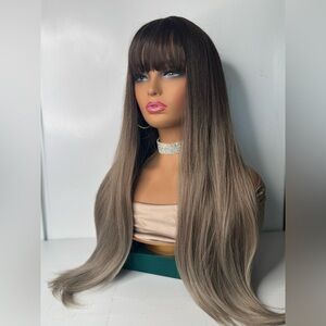 Light Ash Blonde Balayage Brown Roots long Hair Wig with Bangs 28 in Realistic