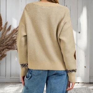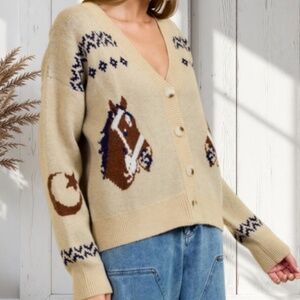 Light Beige Horse Knit Button Front Cardigan Sweater Relaxed Fit Western