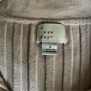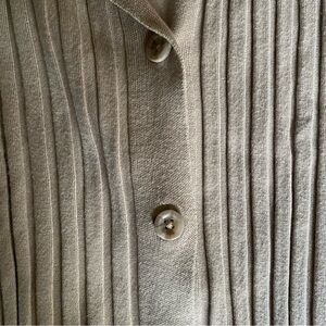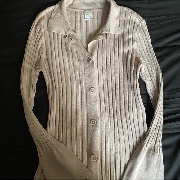 Soft ribbed knit cardigan with a classic collar. Button-front closure and long sleeves. Lightweight and versatile layering piece in neutral beige.