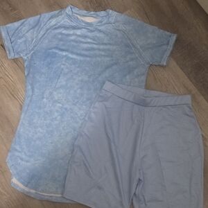 Stylish light blue activewear set. Includes top and shorts. Perfect for workouts or casual wear.