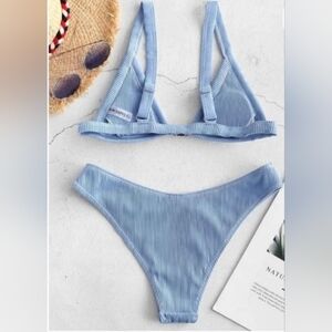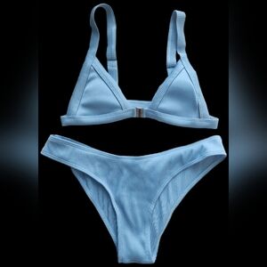 Stylish light blue bikini set. Features a ribbed texture and a front clasp. Almost a microbikini top, cheeky bottoms. Never been worn.