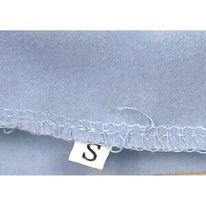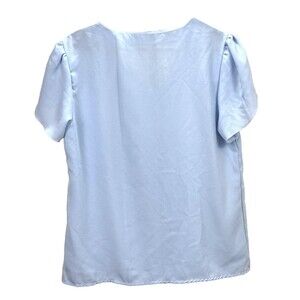 Light blue blouse in size small. Pullover fit with white buttons designed as a faux-button up. Short flutter-split sleeves, v-neckline, and bust darts provide a feminine silhouette. Lightweight, easy care polyester construction. Lovely top perfect for work, casual weekends, and desk to dinner.