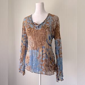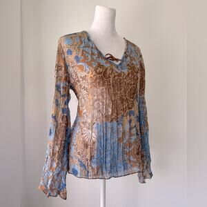 Light Blue & Brown Floral Print Semi-Sheer Accordion Pleated Long Sleeve Blouse