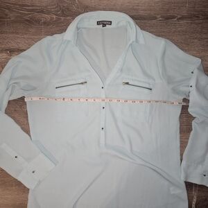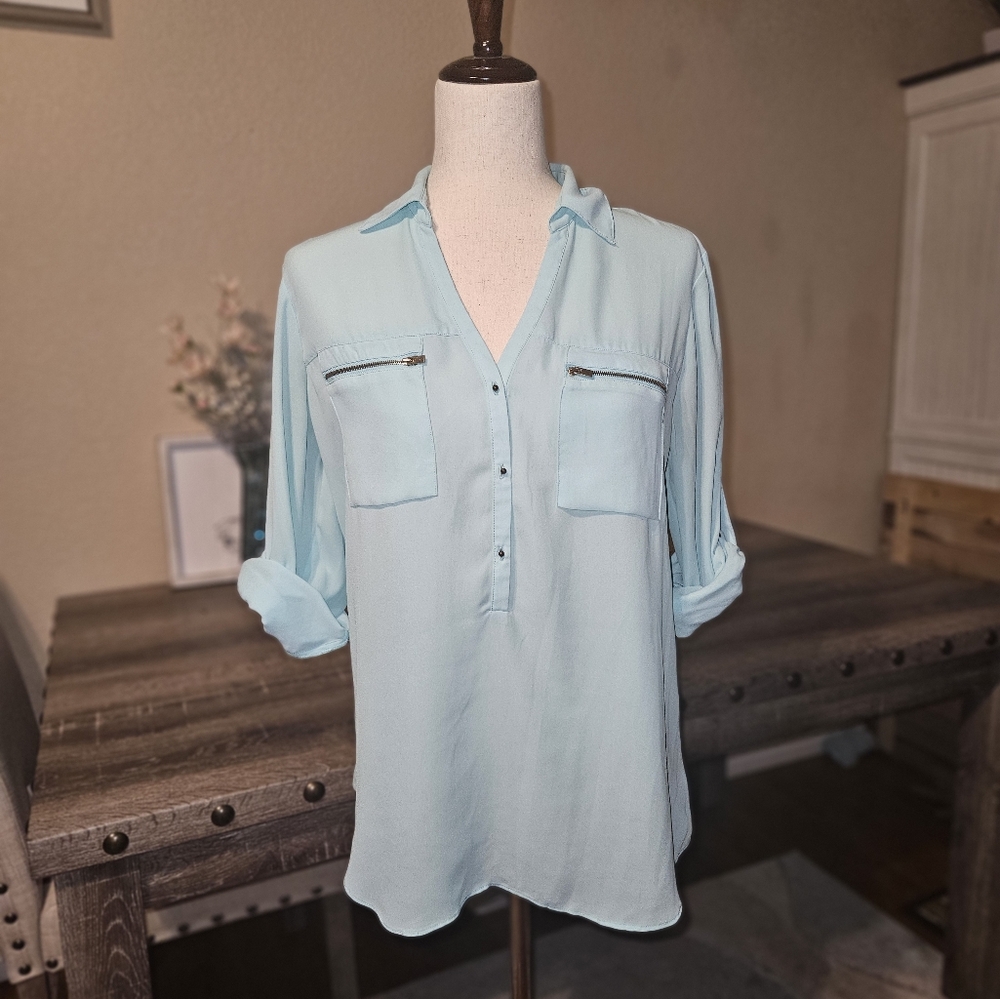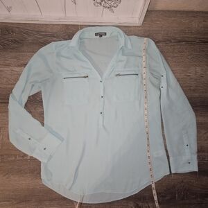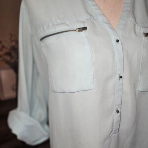 Stylish light blue button-up blouse with front pockets. Perfect for casual or office wear.