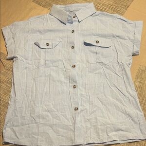 Casual light blue button-up shirt with short sleeves and front pockets.