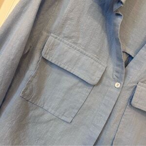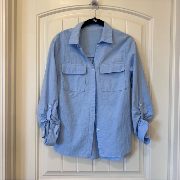 Stylish light blue button-up shirt with front pockets and rolled sleeves. Perfect for spring.