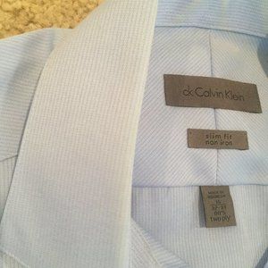 Calvin Klein Slim Fit Non-Iron Dress Shirt. Color is light blue, and is more blue than appears in the pictures. Neck size is 15, sleeve length 32-33. This is a nice dress shirt and was only worn once. Original price was $80, bought from Men's Warehouse.