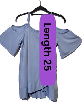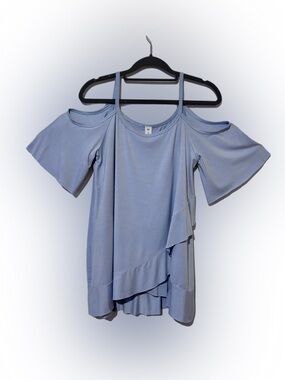 Soft light blue cold-shoulder blouse with ruffle detail. Spaghetti straps and flutter sleeves. Flowy, feminine silhouette. Easy to pair with jeans or skirts.