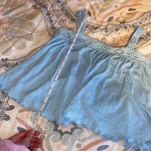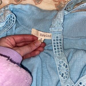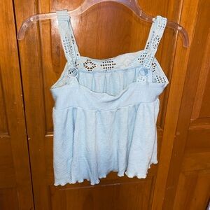 Rewind light blue flowy ribbed tank with crochet embellishment. Small Bust: 15” Length: 16.5” (adjustable straps)