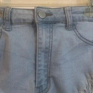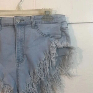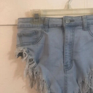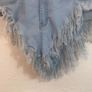 Keywords: denim shorts, frayed hem, high waisted shorts, light blue wash, festival shorts, rave shorts, distressed denim, womens shorts, casual shorts, summer shorts, party shorts, fashion shorts, trendy shorts, unique shorts