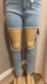 Trendy light blue jeans with knee cutouts. Distressed style for a casual look.