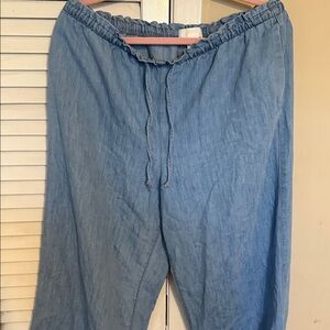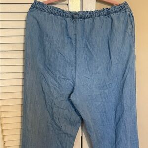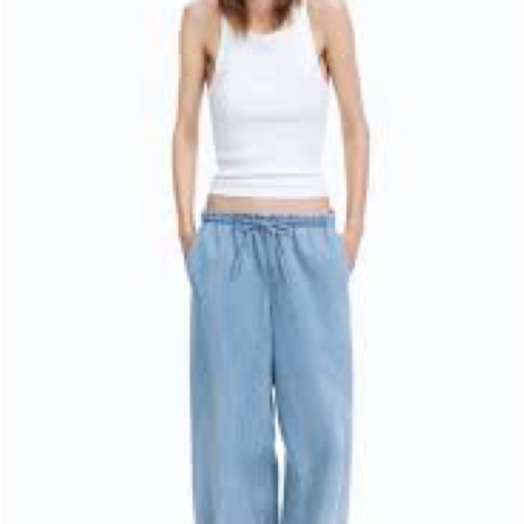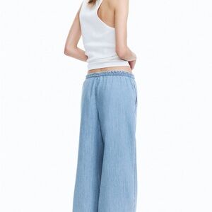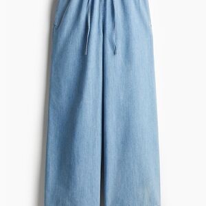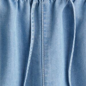 Loose-fit pants in soft denim. High, ruffle-trimmed waist, narrow drawstring and covered elastic at waistband, and discreet side pockets. Wide legs.