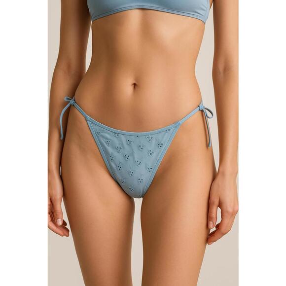 Soft, feminine, and delicately embroidered, this light-blue bikini bottom is both flattering and comfortable. Features beautiful eyelet floral detailing in front and sheer, lightweight sides. Adjustable tie-style straps allow for a customizable fit.