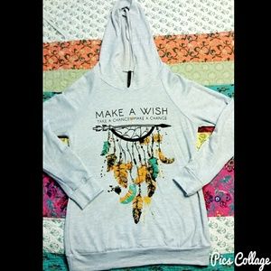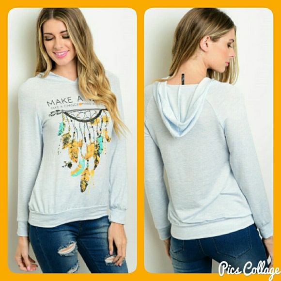 Super SOFT, lightweight, light blue hoodie with gold & teal feathers/dream-catcher print, says, "Make a Wish, Take a Chance, Make a Change." Fits true to size. 65% rayon, 31% polyester, 4% spandex. Made in USA.
