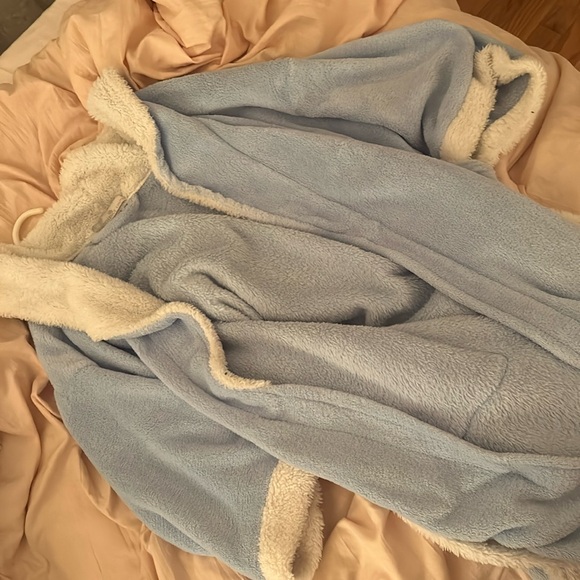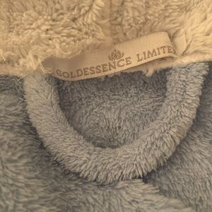 Blue and White fluffy robe by Goldessence Limited. Very comfortable. Short sleeve and shorter length robe.
