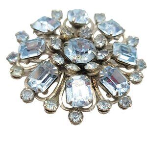 Light Blue Glass Rhinestone Large Flower Silver Tone Vintage Brooch Vintage