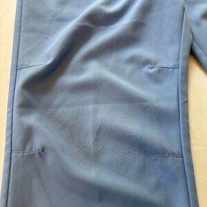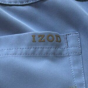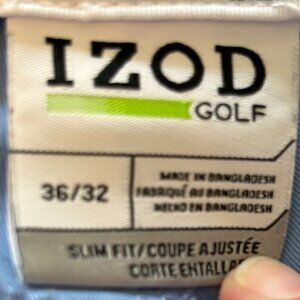 Comfortable and practical Slim Fit 100% Polyester Golf Pants by Izod Golf in a light blue color. Design features include Comfort Waistband with button closure and zip fly. Front Slash Pockets, Rear Patch Pockets, Side Leg Hem Vents and Knee Darts for ease of movement on the course. Easy care machine washable and machine dryable. Size 36 Waist, 32 Inseam with measurements taken flat and unstretched: Waist 18", Front Rise 11 1/2", Inseam 30". In Excellent Preowned Condition!