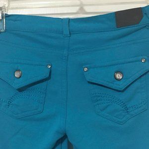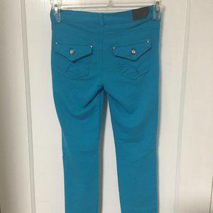 Light blue jeggings from the YASO Brand with studded buttons on the front and back.