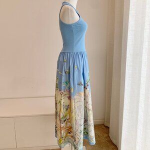 This dress features a fresh light blue as its primary hue. The top is crafted from ribbed knit fabric with a sleeveless design, offering a flattering fit and comfortable texture. The skirt showcases an artfully printed fabric depicting narrative-rich patterns, blending vintage charm with distinctive flair. The silhouette features a cinched waist and full skirt, seamlessly merging simplicity with artistic expression. Whether worn for everyday outings or intimate gatherings, it effortlessly exudes a unique romantic style.