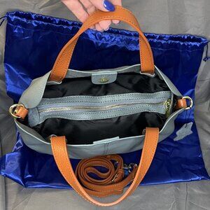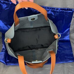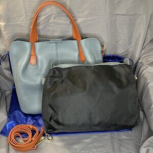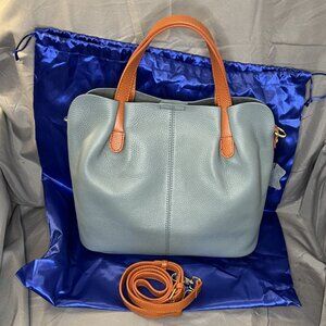 Light Blue Leather Tote, Orange Handles & Crossbody Strap, Removable Inner Pouch